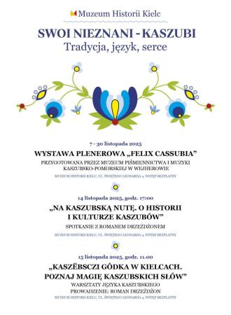Od 7 listopada, od godz. 13.00, w Małej Galerii Muzeum Historii Kielc można oglądać wystawę plenerową „Felix Cassubia” przygotowaną przez Muzeum Piśmiennictwa i Muzyki Kaszubsko-Pomorskiej w Wejherowie. Ekspozycja prezentuje bogactwo tradycji, języka i kultury Kaszub – jednej z najciekawszych regionalnych wspólnot Polski. Wystawa czynna będzie do końca listopada.