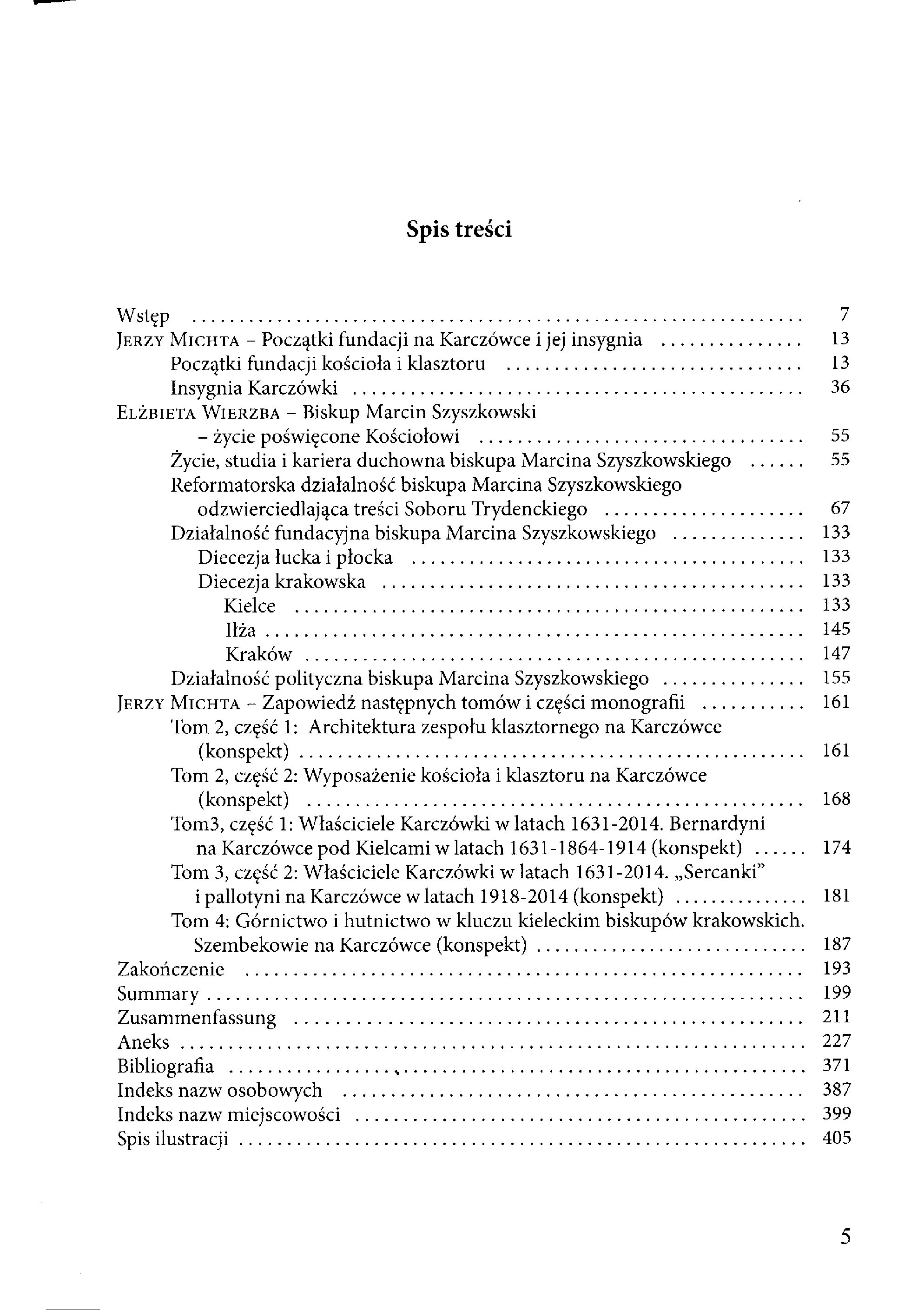 Pierwszy tom z serii poświęconej monografii kościoła i klasztoru na Karczówce w Kielcach przygotowywanej z okazji zbliżającego się 400-lecia fundacji kościoła. W publikacji opis początków fundacji oraz postaci jej fundatora, biskupa Marcina Szyszkowskiego. Wydawnictwo z licznymi unikalnymi ilustracjami.